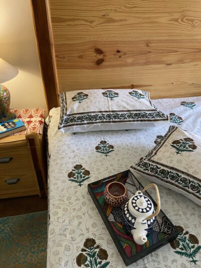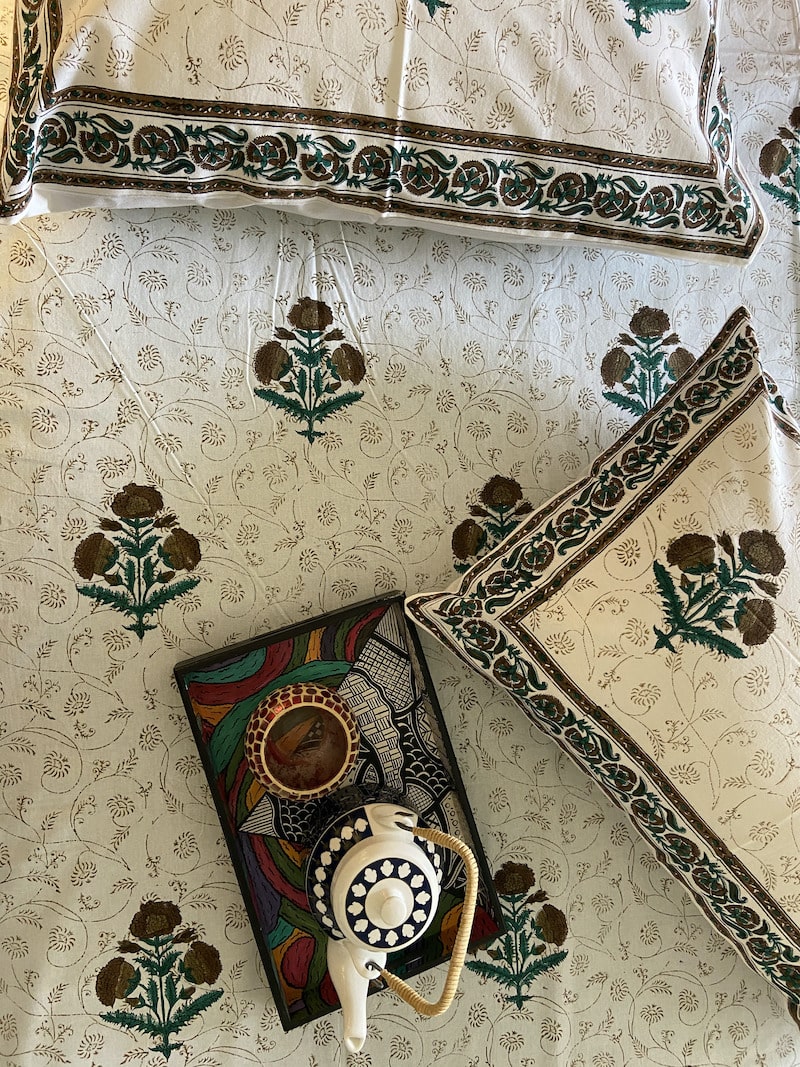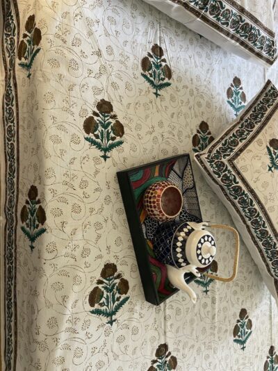 Hand block printing is a centuries old art form in India. It is also referred to as “block printing” or “woodblock printing”. This ancient printing technique utilises a hand carved teak wood block that is dipped in dye and stamped by hand onto cotton or silk. The result is truly unique , hand block printed fabric that connects us to a rich tradition and history of handmade crafts.