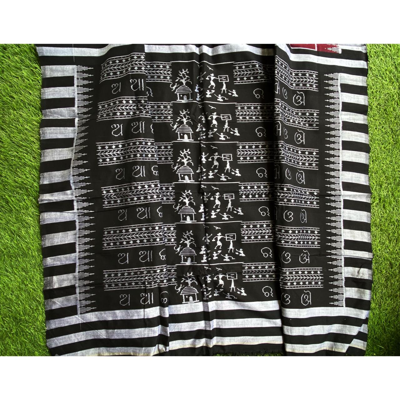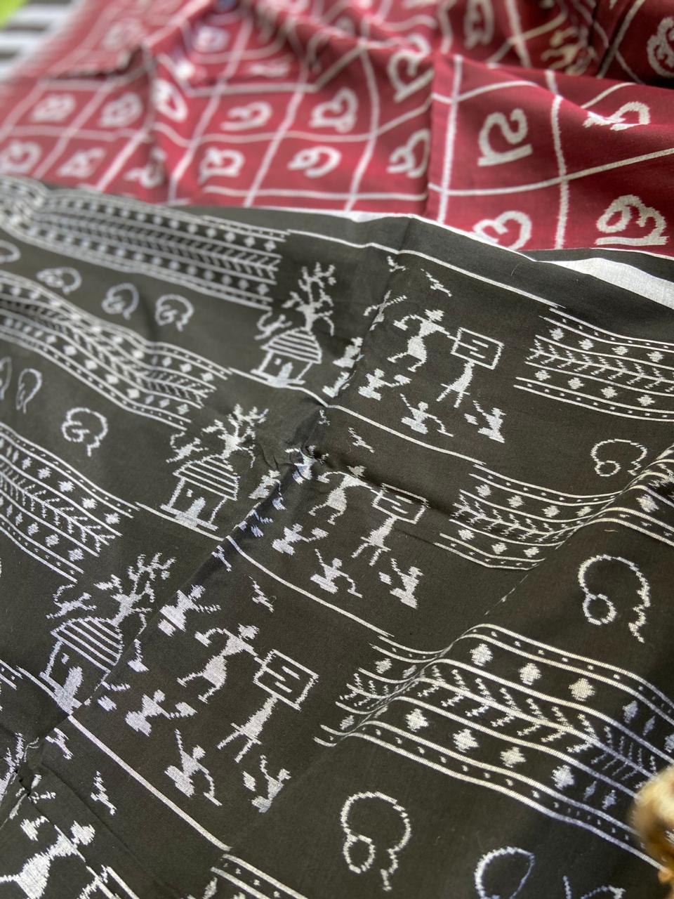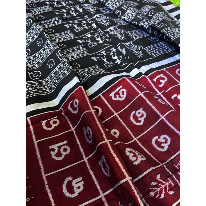 Khandua (Also Maniabandi or Kataki) is a traditional “bandha” or ikat sari produced from Odisha worn by women during wedding and a special type of which is worn by Jagannath. The clothes contain texts of Gita Govinda on them. Kenduli Khandua, a special form of Khandua of 12 ft and 2 kani (each kani measures the length of a hand) is offered to Jagannath to wear as khandua with stanzas and illustration from Gita Govinda. This saree is a depiction of fauna. The weavers from Nuapatna region often take inspiration from nature. They weave what they see.