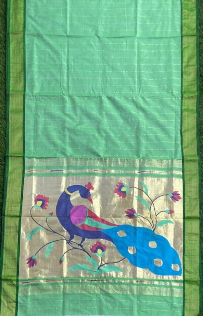 Paithani is a variety of saree, named after Paithan town in Aurangabad from Maharashtra. Present day Yeola town , Maharashtra is the largest manufacturer of Paithani. Paithani is characterized by borders of an oblique square design , and a pallu with a Peacock design. Plain as well as spotted designs are available. Among other varieties, single coloured and kaleidoscope coloured designs are also popular.This effect is achieved by using one colour for weaving lengthwise another for weaving width wise.