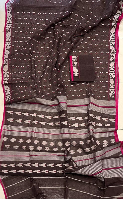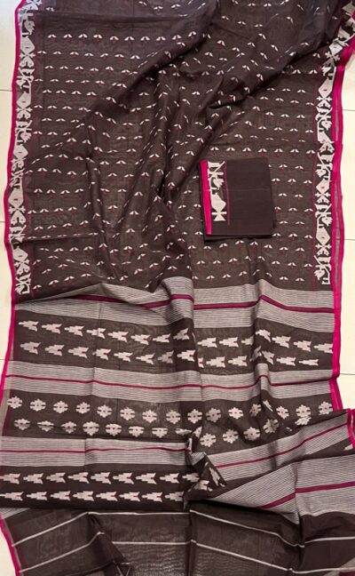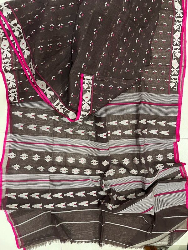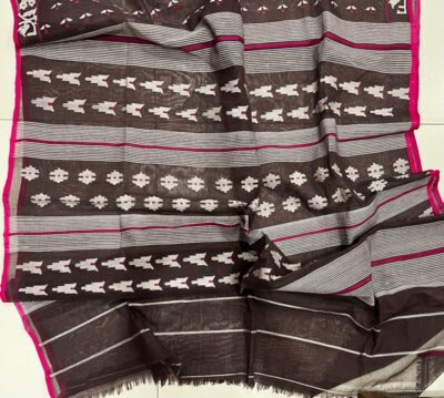 The centuries- old Jamdani (or Dhakai Jamdani) weaving tradition originated in Dhaka, Bangladesh . These are feather – light and sheer sarees, with fine motifs woven all over the body giving it a luxurious and grand finish.