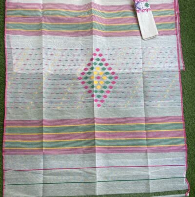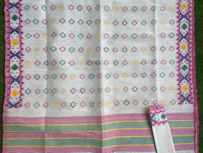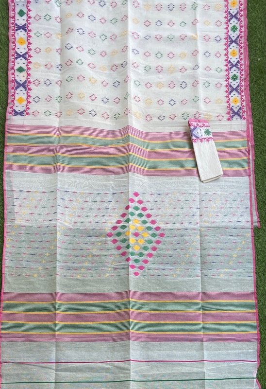 The centuries- old Jamdani (or Dhakai Jamdani) weaving tradition originated in Dhaka, Bangladesh . These are feather – light and sheer sarees, with fine motifs woven all over the body giving it a luxurious and grand finish.