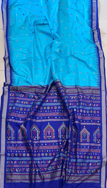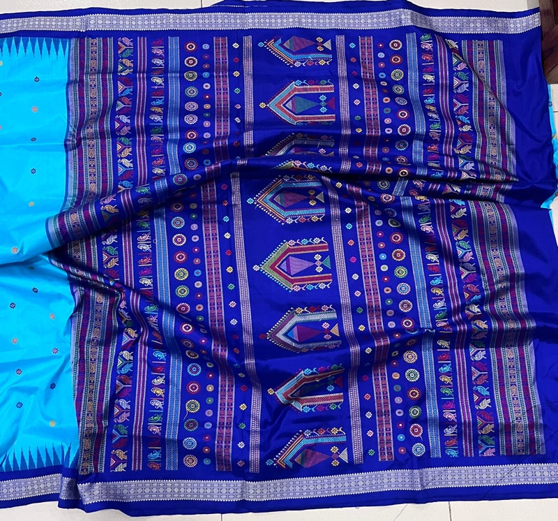 Sambalpuri sarees are known for their incorporation of traditional motifs like shankha (shell), chakra (wheel), phula (flower), all of which have deep symbolism with the native Odia colour red black and white represent true Odia Culture alongwith Lord Kaalia(Jagannatha)’s face colour,