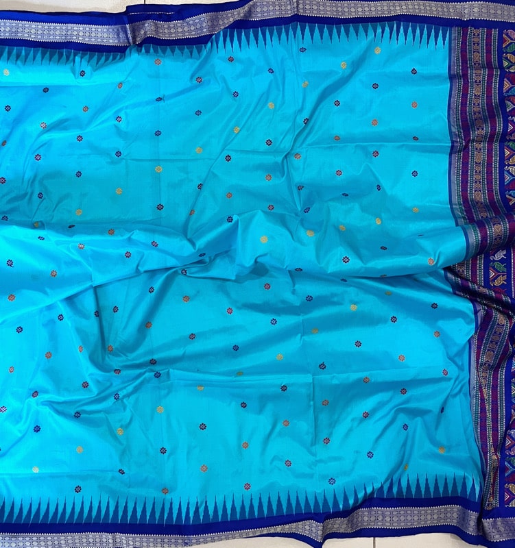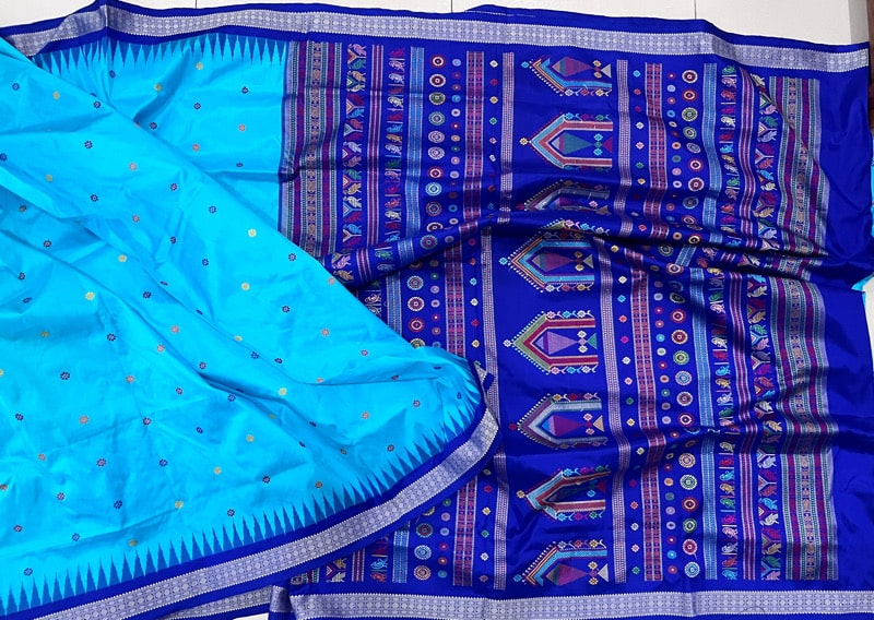 Two versions of Jagannath iconography but the highpoint of these sarees is the traditional craftsmanship of the ‘Bandhakala’, the Tie-dye art reflected in their intricate weaves, also known as Sambalpuri “Ikkat”. In this technique, the threads are first tie-dyed and later woven into a fabric, with the entire process taking many weeks. These sarees first became popular outside the state when the late Prime Minister Indira Gandhi started wearing them. In the 1980s and 1990s they became popular across India. To provide protection to the weavers practicing this art, the handloom silk sarees manufactured in Sambalpur and Berhampur (Berhampur Pattu) in Odisha were included in the Government of India’s Geographical Indications (GI) registry.