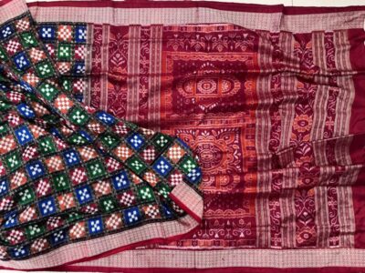 Two versions of Jagannath iconography but the highpoint of these sarees is the traditional craftsmanship of the ‘Bandhakala’, the Tie-dye art reflected in their intricate weaves, also known as Sambalpuri “Ikkat”. In this technique, the threads are first tie-dyed and later woven into a fabric, with the entire process taking many weeks. These sarees first became popular outside the state when the late Prime Minister Indira Gandhi started wearing them. In the 1980s and 1990s they became popular across India. To provide protection to the weavers practicing this art, the handloom silk sarees manufactured in Sambalpur and Berhampur (Berhampur Pattu) in Odisha were included in the Government of India’s Geographical Indications (GI) registry.