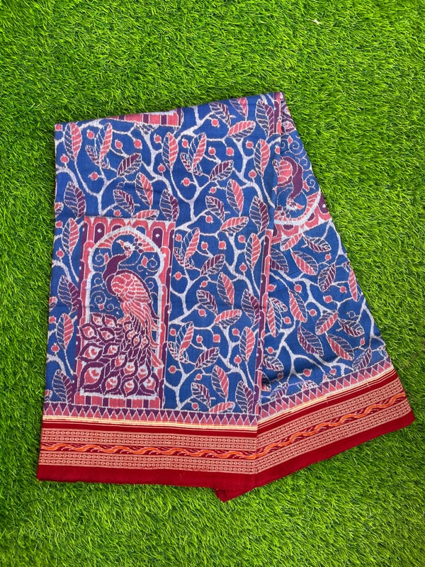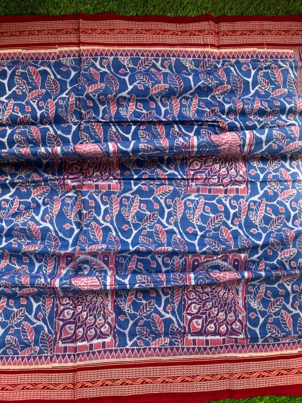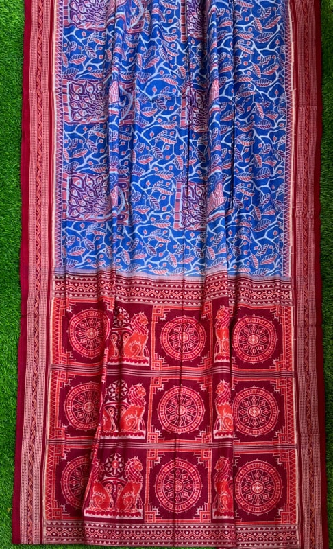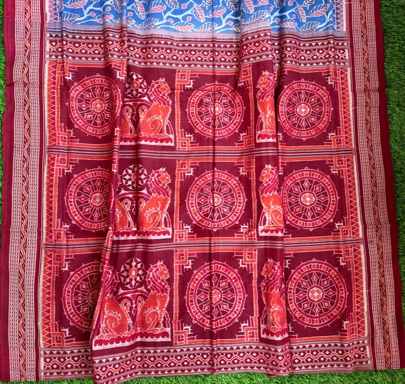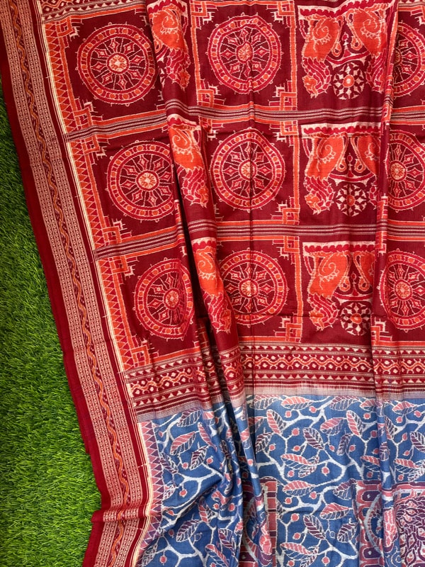Sambalpuri sarees are known for their incorporation of traditional motifs like shankha (shell), chakra (wheel), phula (flower), all of which have deep symbolism with the native Odia colour red black and white represent true Odia Culture alongwith Lord Kaalia(Jagannatha)’s face colour,