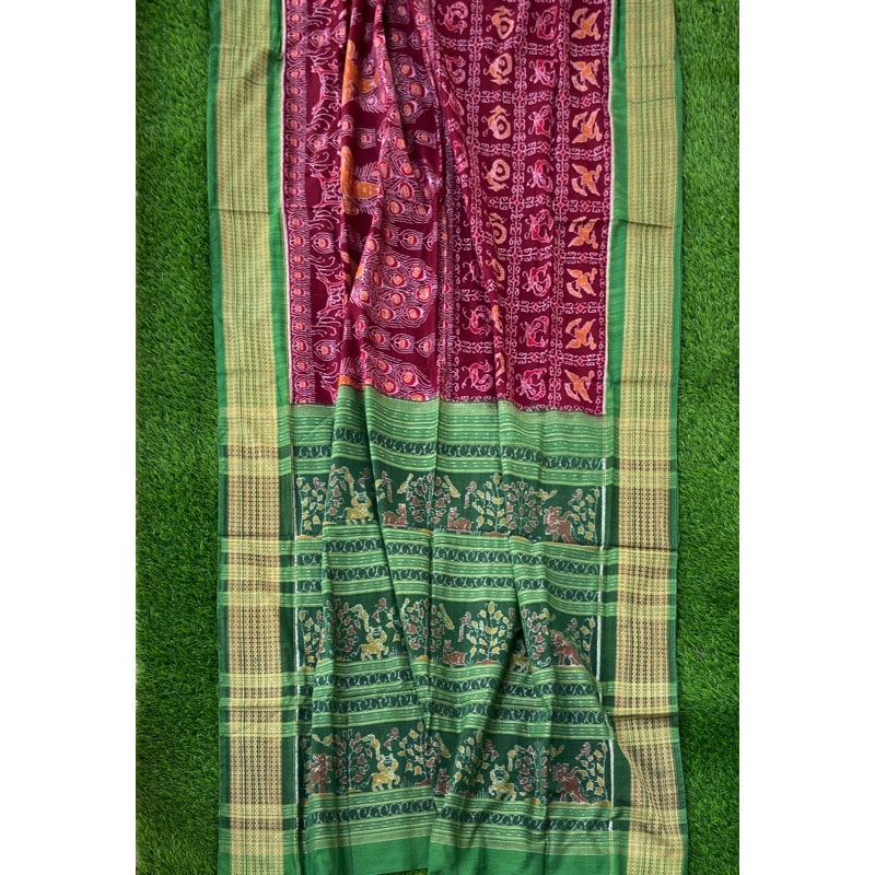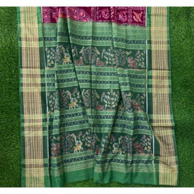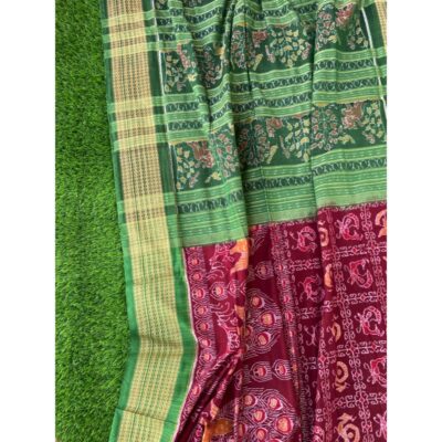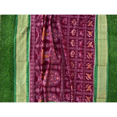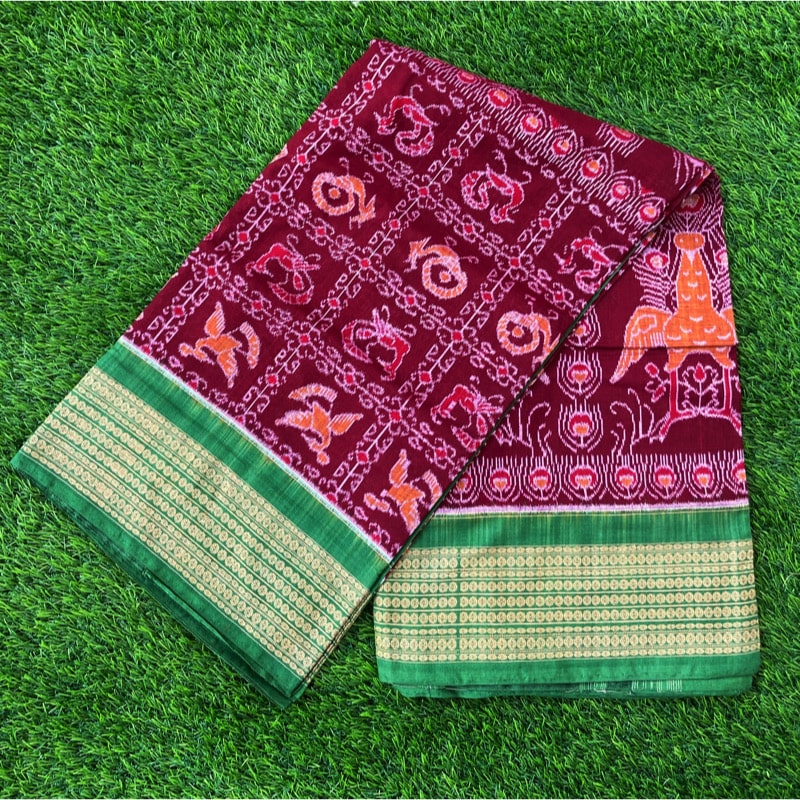 Sambalpuri sarees are known for their incorporation of traditional motifs like shankha (shell), chakra (wheel), phula (flower), all of which have deep symbolism with the native Odia colour red black and white represent true Odia Culture alongwith Lord Kaalia(Jagannatha)’s face colour,