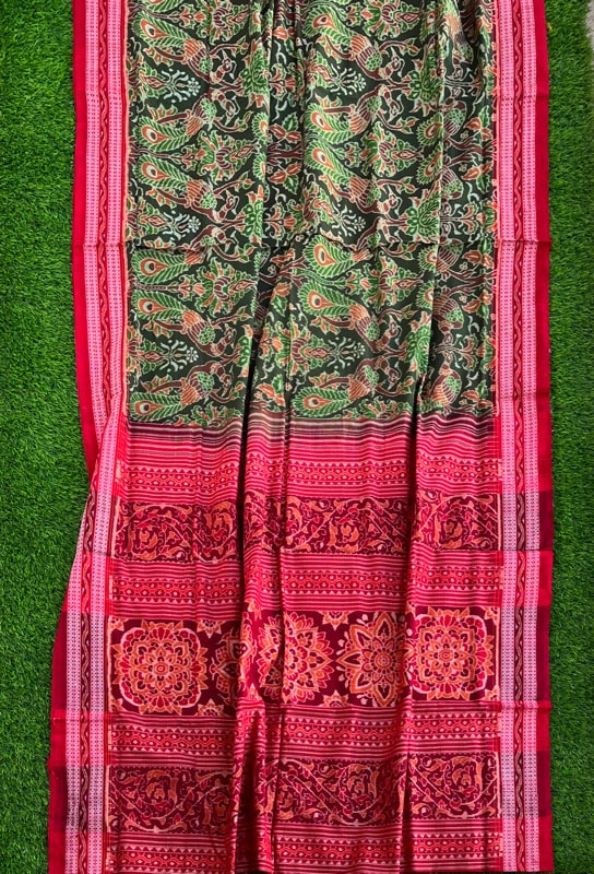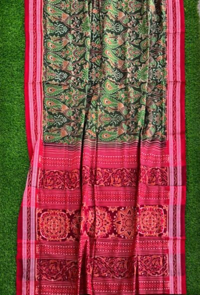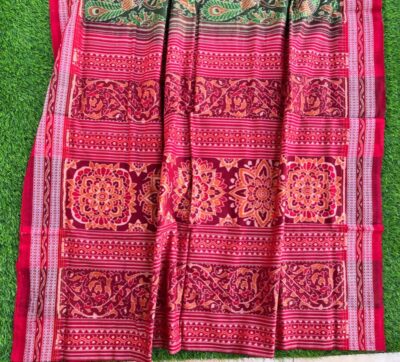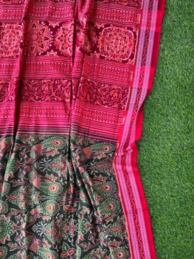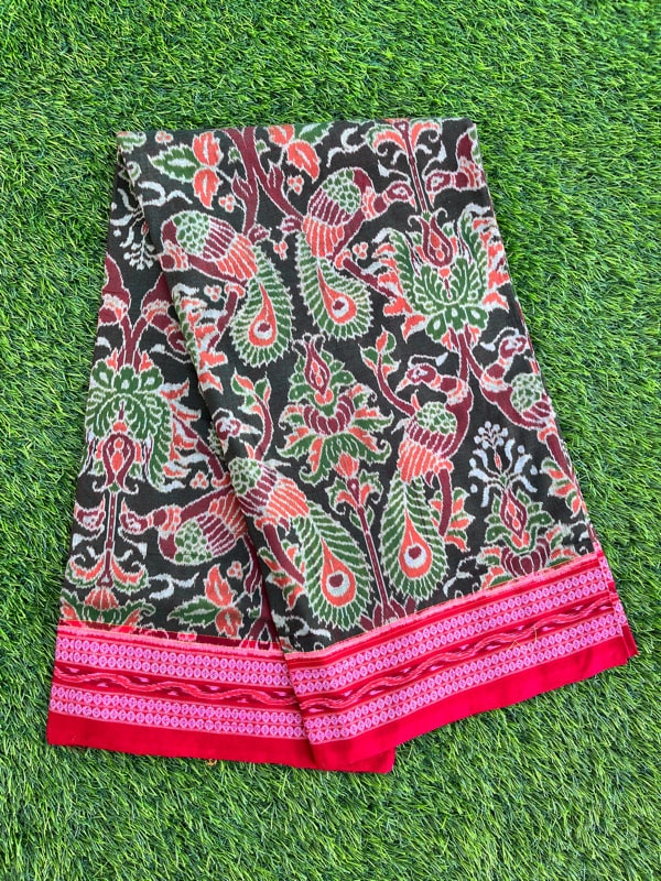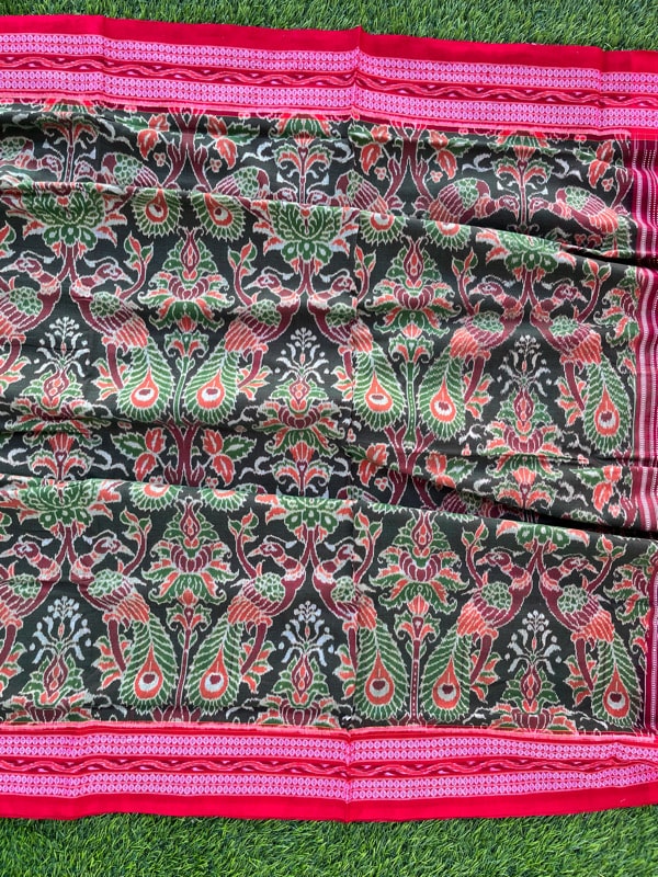 Sambalpuri sarees are known for their incorporation of traditional motifs like shankha (shell), chakra (wheel), phula (flower), all of which have deep symbolism with the native Odia colour red black and white represent true Odia Culture alongwith Lord Kaalia(Jagannatha)’s face colour,