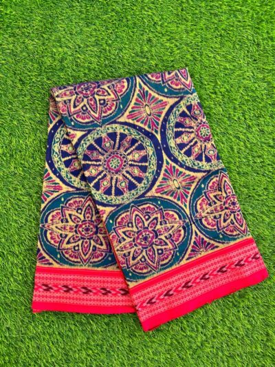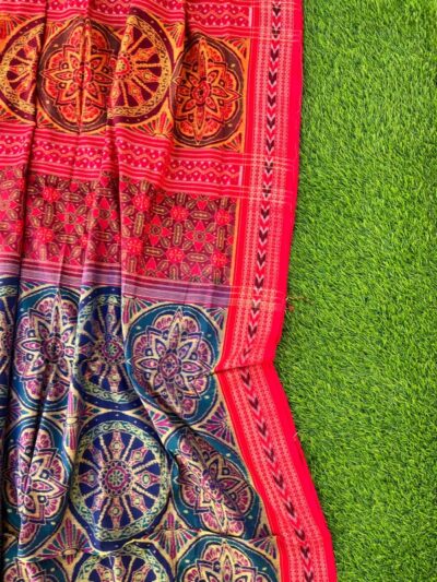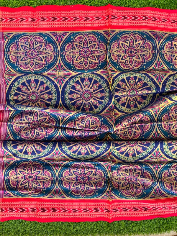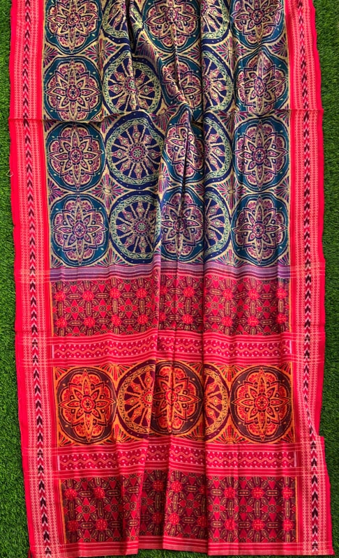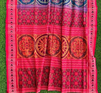 Sambalpuri sarees are known for their incorporation of traditional motifs like shankha (shell), chakra (wheel), phula (flower), all of which have deep symbolism with the native Odia colour red black and white represent true Odia Culture alongwith Lord Kaalia(Jagannatha)’s face colour,
