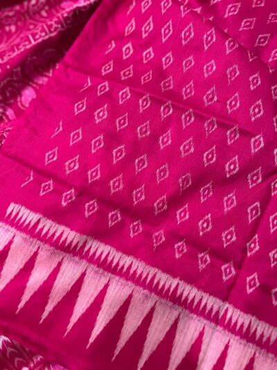Two versions of Jagannath iconography but the highpoint of these sarees is the traditional craftsmanship of the ‘Bandhakala’, the Tie-dye art reflected in their intricate weaves, also known as Sambalpuri “Ikkat”. In this technique, the threads are first tie-dyed and later woven into a fabric, with the entire process taking many weeks. These sarees first became popular outside the state when the late Prime Minister Indira Gandhi started wearing them. In the 1980s and 1990s they became popular across India. To provide protection to the weavers practicing this art, the handloom silk sarees manufactured in Sambalpur and Berhampur (Berhampur Pattu) in Odisha were included in the Government of India’s Geographical Indications (GI) registry.