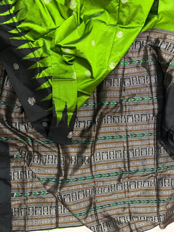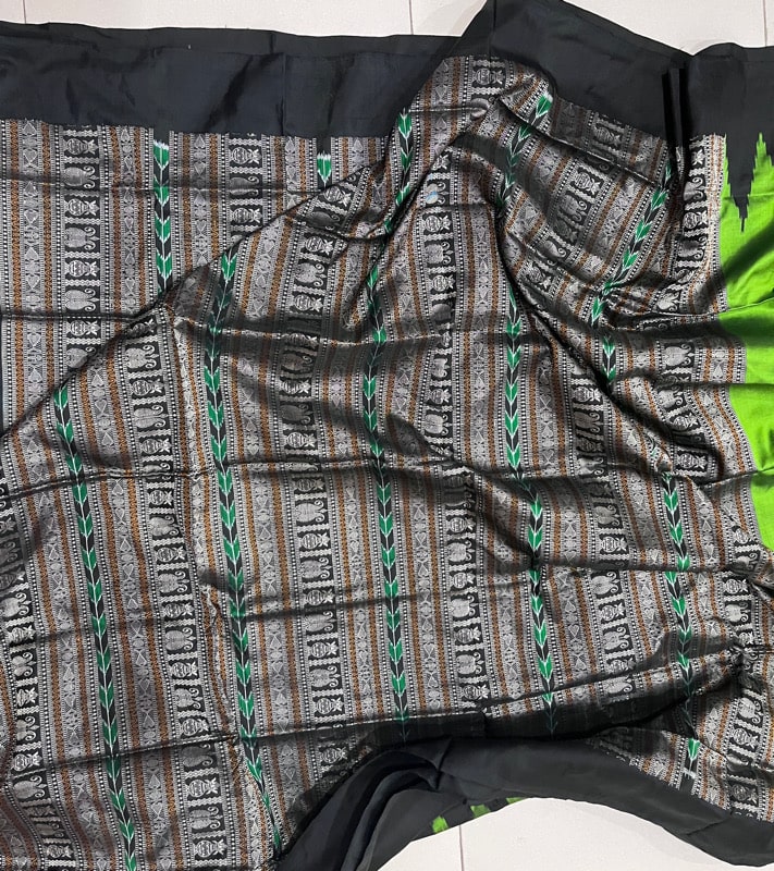 Sambalpuri sarees are known for their incorporation of traditional motifs like shankha (shell), chakra (wheel), phula (flower), all of which have deep symbolism with the native Odia colour red black and white represent true Odia Culture alongwith Lord Kaalia(Jagannatha)’s face colour,
