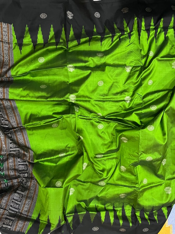 Two versions of Jagannath iconography but the highpoint of these sarees is the traditional craftsmanship of the ‘Bandhakala’, the Tie-dye art reflected in their intricate weaves, also known as Sambalpuri “Ikkat”. In this technique, the threads are first tie-dyed and later woven into a fabric, with the entire process taking many weeks. These sarees first became popular outside the state when the late Prime Minister Indira Gandhi started wearing them. In the 1980s and 1990s they became popular across India. To provide protection to the weavers practicing this art, the handloom silk sarees manufactured in Sambalpur and Berhampur (Berhampur Pattu) in Odisha were included in the Government of India’s Geographical Indications (GI) registry.