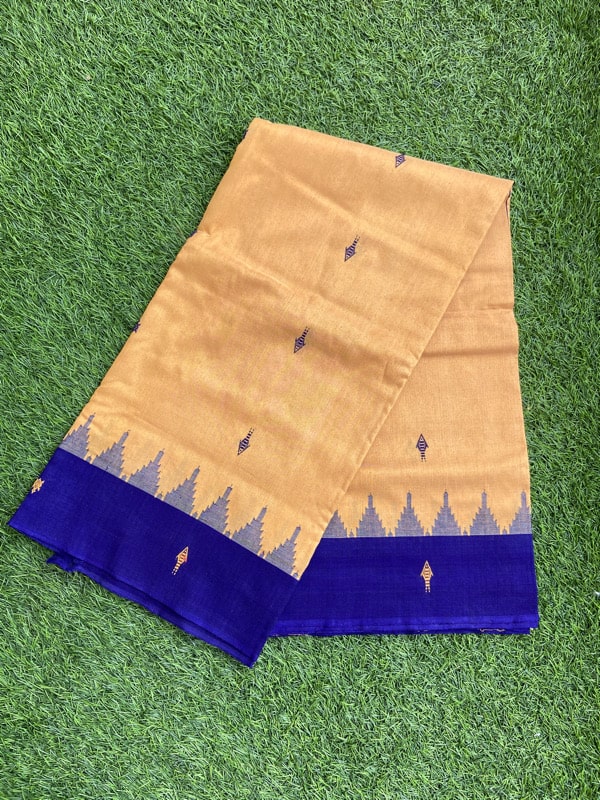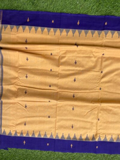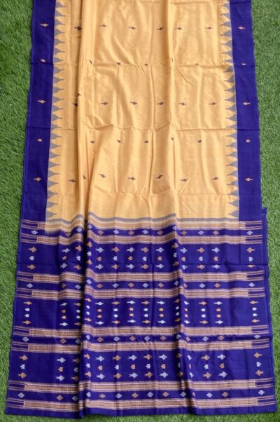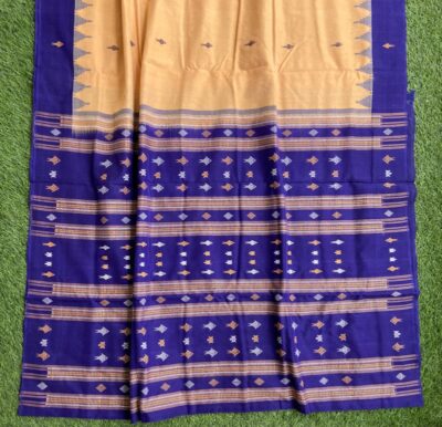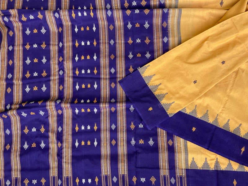 Two versions of Jagannath iconography but the highpoint of these sarees is the traditional craftsmanship of the ‘Bandhakala’, the Tie-dye art reflected in their intricate weaves, also known as Sambalpuri “Ikkat”. In this technique, the threads are first tie-dyed and later woven into a fabric, with the entire process taking many weeks. These sarees first became popular outside the state when the late Prime Minister Indira Gandhi started wearing them. In the 1980s and 1990s they became popular across India. To provide protection to the weavers practicing this art, the handloom silk sarees manufactured in Sambalpur and Berhampur (Berhampur Pattu) in Odisha were included in the Government of India’s Geographical Indications (GI) registry.