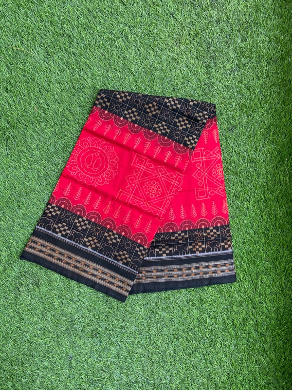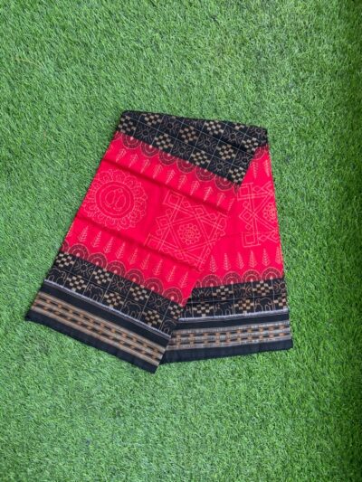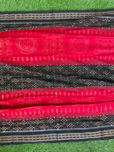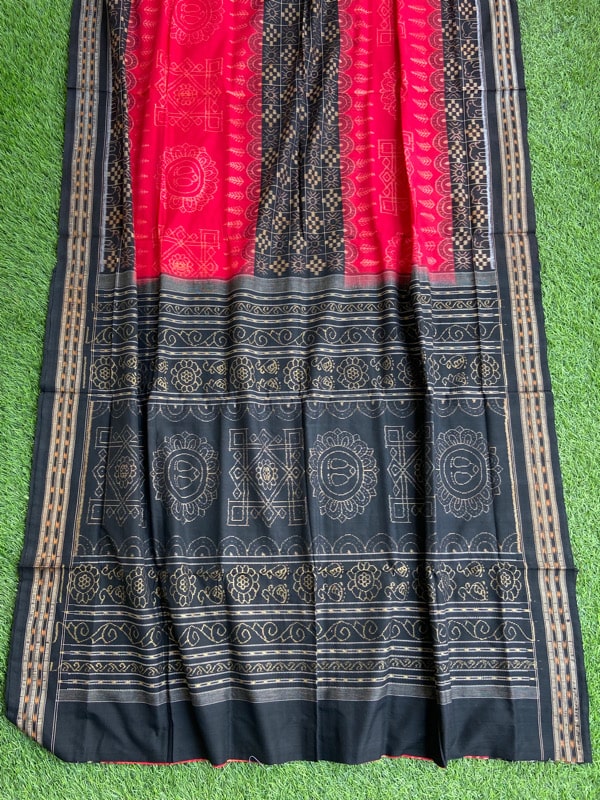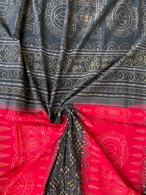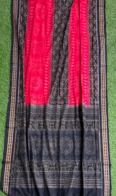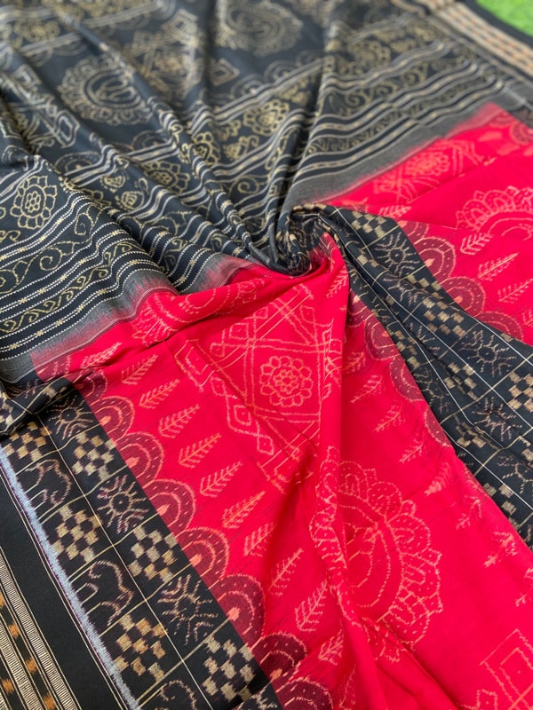 Sambalpuri sarees are known for their incorporation of traditional motifs like shankha (shell), chakra (wheel), phula (flower), all of which have deep symbolism with the native Odia colour red black and white represent true Odia Culture alongwith Lord Kaalia(Jagannatha)’s face colour,