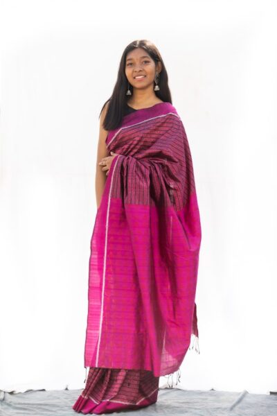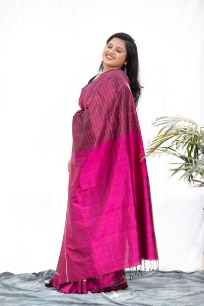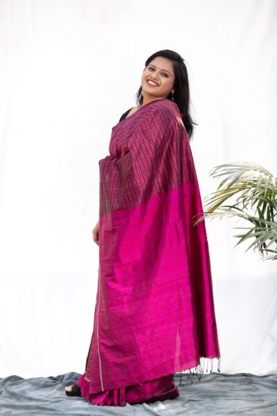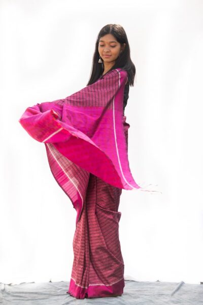 Odisha Ikat is a kind of ikat, resist dyeing technique, originating from Indian state of Odisha. Also known as “Bandha of Odisha”, it is a geographically tagged product of Odisha since 2007. It is made through a process of tie-dying the warp and weft threads to create the design on the loom prior to weaving. It is unlike any other ikat woven in the rest of the country because of its design process, which has been called “poetry on the loom”. This design is in vogue only at the western and eastern regions of Odisha; similar designs are produced by community groups called the Bhulia, Kostha Asani, and Patara. The fabric gives a striking curvilinear appearance. Saris made out of this fabric feature bands of brocade  in the borders and also at the ends, called anchal or pallu. Its forms are purposefully feathered, giving the edges a “hazy and fragile” appearance.Â