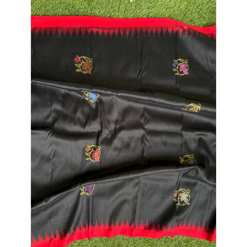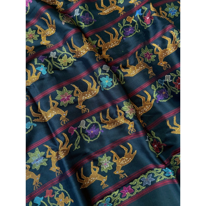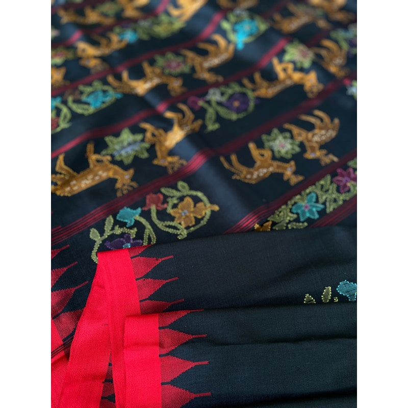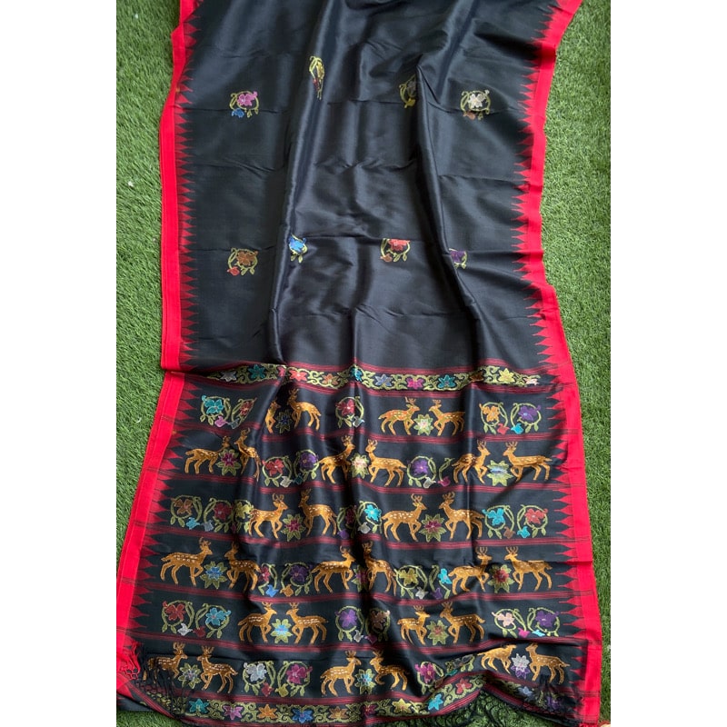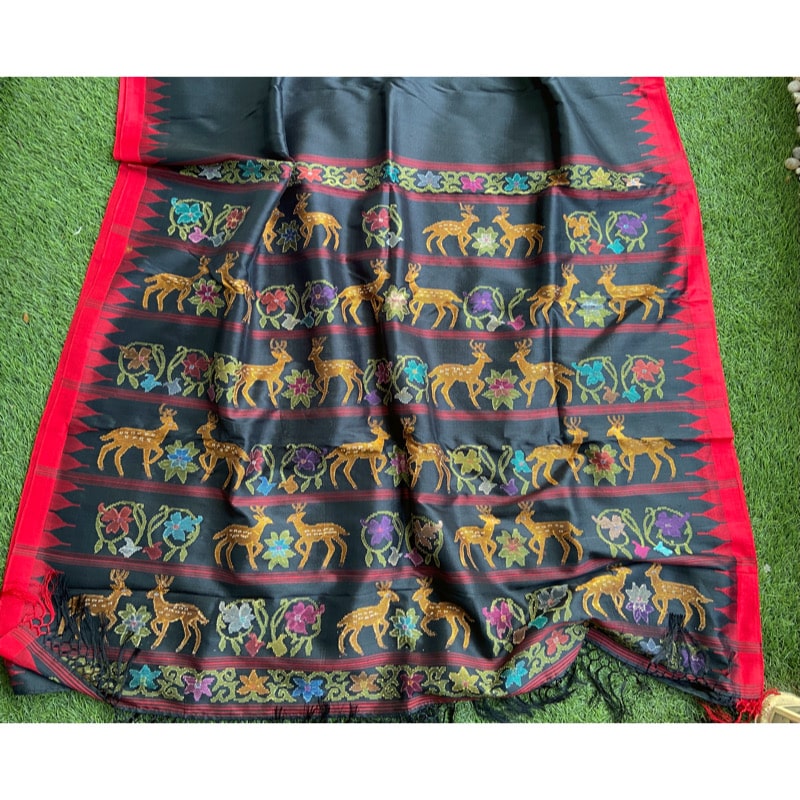 The fibre used to make the yarn is a derivative of “Lashing” (Cotton ball) and “Kabrang” (Mulberry cocoon). It is also extracted from the bark of the tree species, locally called as “Santhak” . The local fibre is spun into threads and then dyed using plants and bark. The dyed yarn is subject to sizing by applying starch made of rice, and then stretched across using a bamboo rod, which is followed by winding into bobbin.