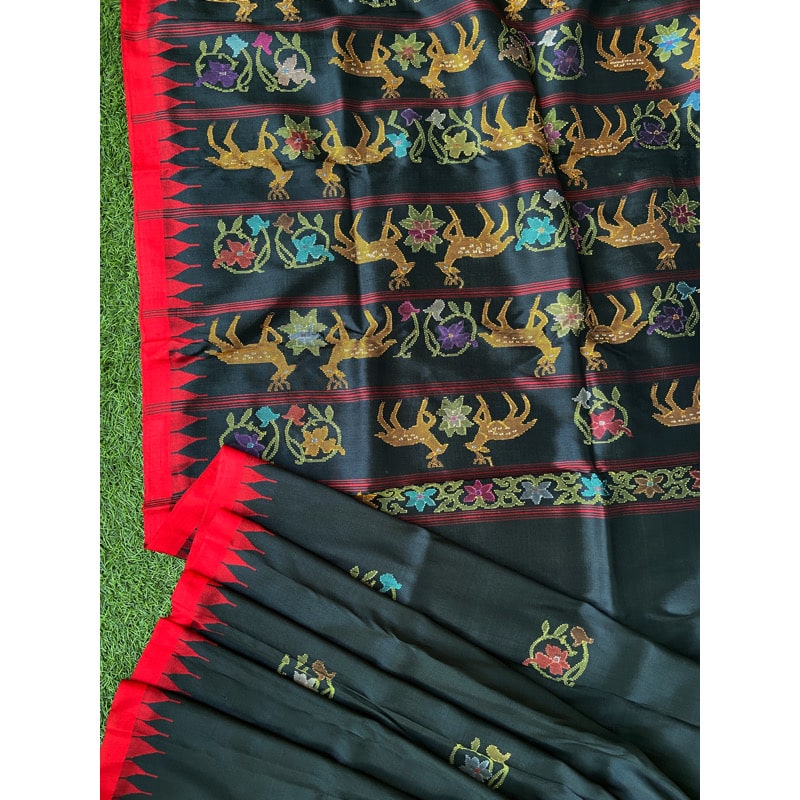 The “MoirangPheejin” design, known in local language as Yarongphi (‘ya’ means “tooth”, ‘rong’ means “long” and ‘longba’ means “pronged”), which is weaved over the Moirang Phee fabric is stated to represent the thin and pointed teeth of the “Pakhangba”, the Pythonic god in Manipur mythology. This motif, arranged in varying steps, on the longitudinal border of the main fabric woven during the first stage, has a sharp edge at the top and is woven sequentially to give an aesthetic appearance to the fabric. The triangular shaped design elongates on odd numbers of steps (such as 3, 5, 9, 11 and so forth) towards the center of the cloth on which it is woven, and is parallel to weft threads. This design is made to suit the fabric such as a saree, stole, sarong, school uniforms, lungi, skirtsand half sari. The count of the weft of cotton or silk yarn used varies from 2/40S to 2/80S. The fabric is woven by women, and is used by them during marriages and other festivities.