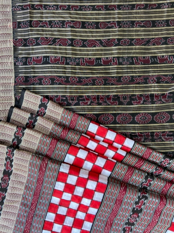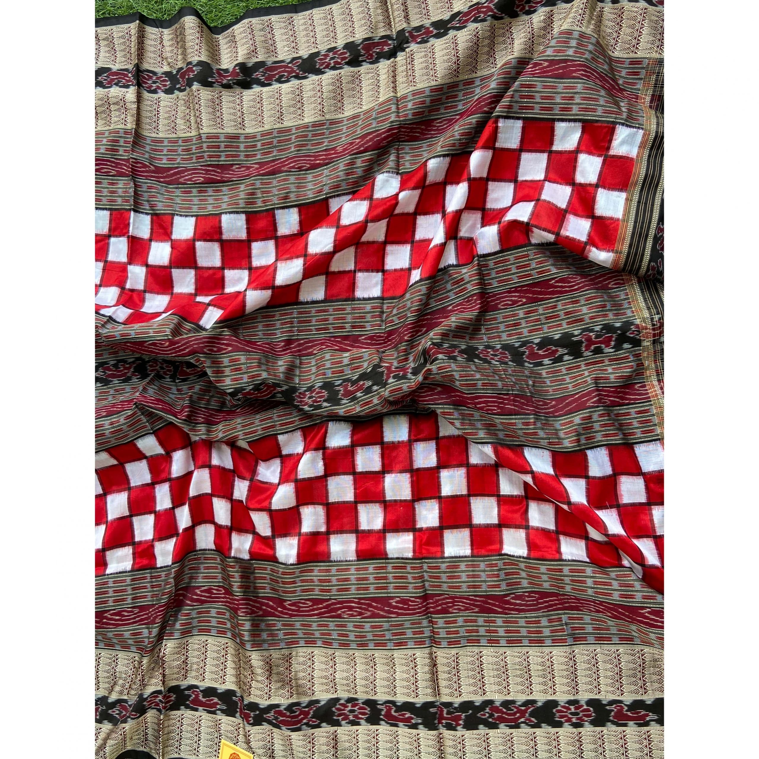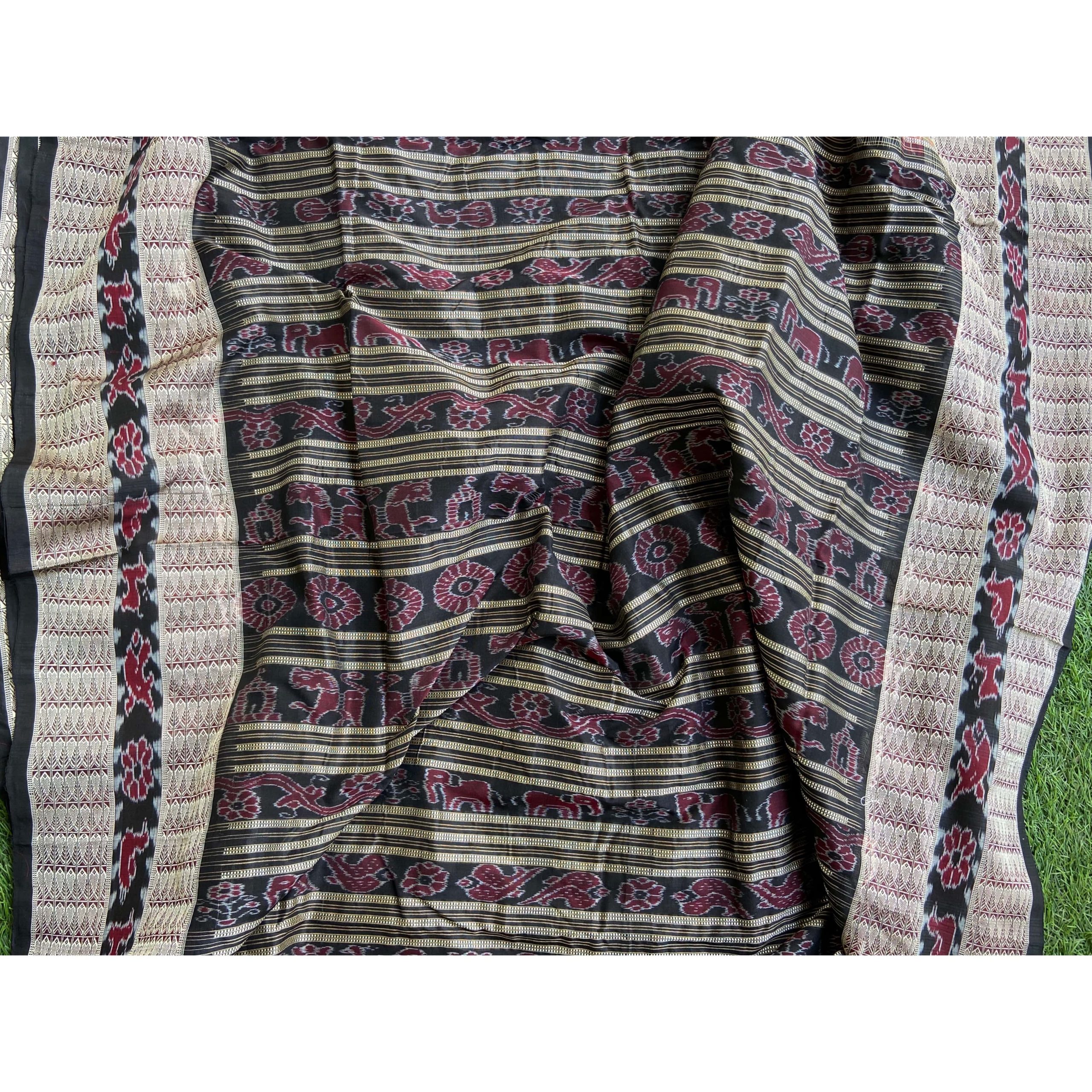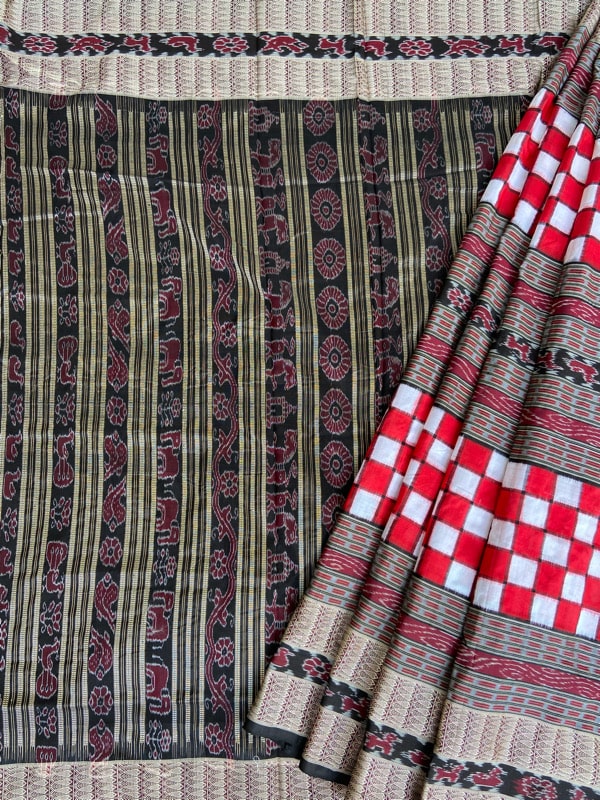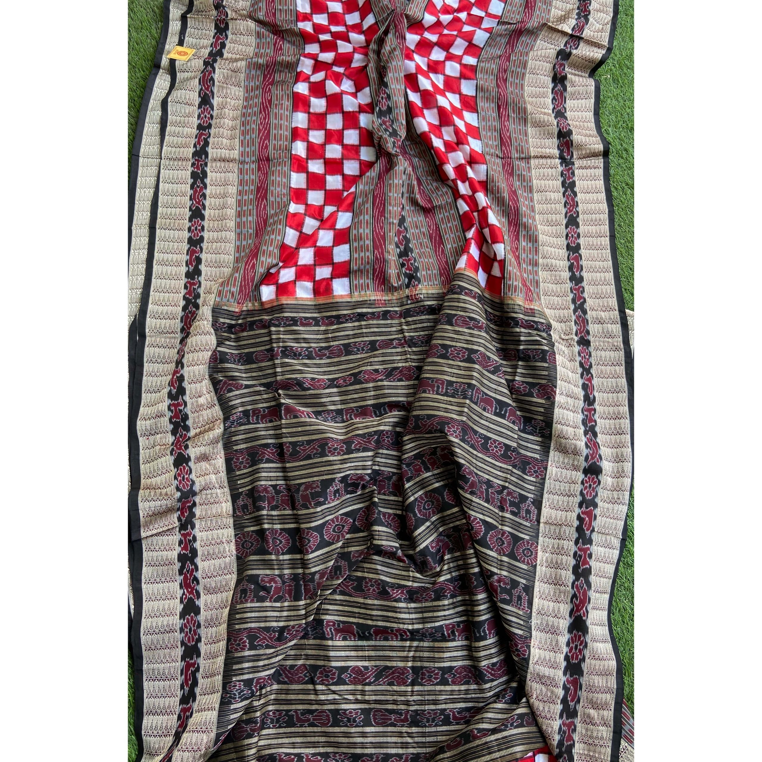 This the all time favorite and highest selling traditional look Orissa Handloom silk saree. As an Orissa special saree the specialty of this saree is its geometric design in the body and touch of traditional culture in the form of different motifs like Shankha (Shell), Chakra(Wheel), phulla (flower), animals with deep symbolism. The broad border of silk thread work , motif works and completely traditional aanchal or pallu are the beautiful feature of the saree. The uniqueness in this saree is that its having a traditional border in middle which makes the saree look awesome.