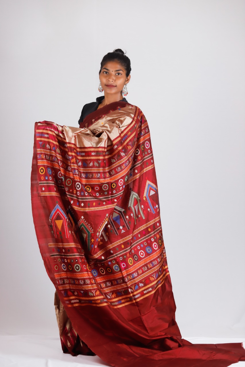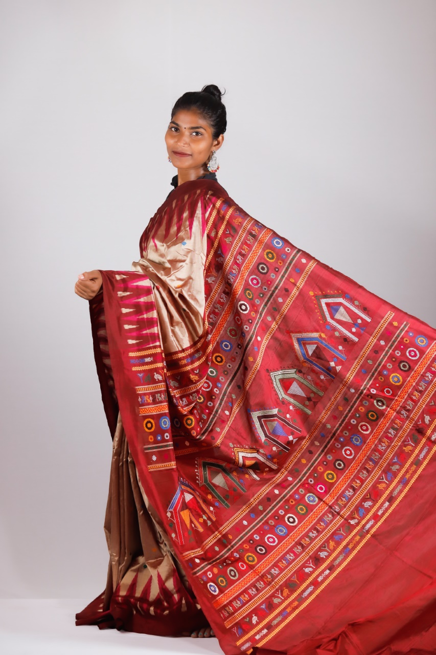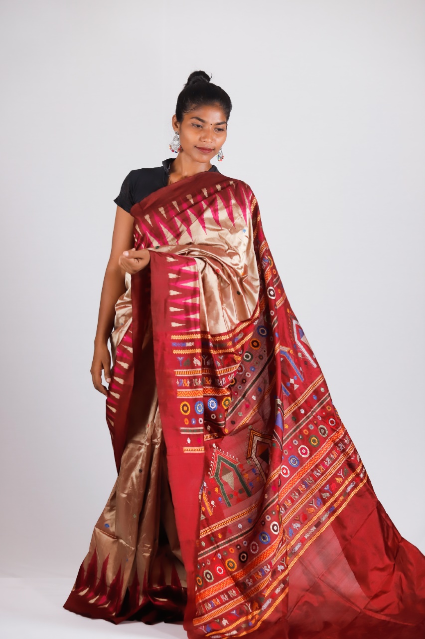 Dolabedi is a saree based on the Dola Utsav that was celebrated. This extraordinary hand-woven treasure speaks of the dolabedi, the Lords in Odisha’s famed temples preparing for a stroll. This is an epic beauty- Dolabedi. Gopalpur in Odisha is well known for its tussar. Jagannath Puri in Odisha is one of the four important Dham (religious place) for Hindus. It is well known for its Rath Yatra (chariot). The gorgeous motif of Dolabedi is a representation of those chariots of Dola Purnima. It represents Lord Jagannath’s blessings. These motifs, which are like a triangle or a dome are woven with extra weft- a technique very common in Naupatna and Gopalpur. There are multicoloured butas in the body. The pallu is very colourful too. The colourful part is offset against the relatively plain and simple body, which actually makes it look regal. The feel of this saree is so soothing to the heart and mind. Its pallu has turtles, parrots and Dola (chariots). It is not any revival saree. In fact, it is a recent innovation with traditional motifs. It is one of the expensive and exquisite Odisha weaves.