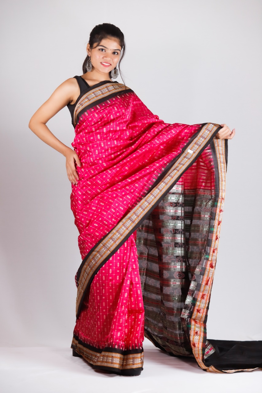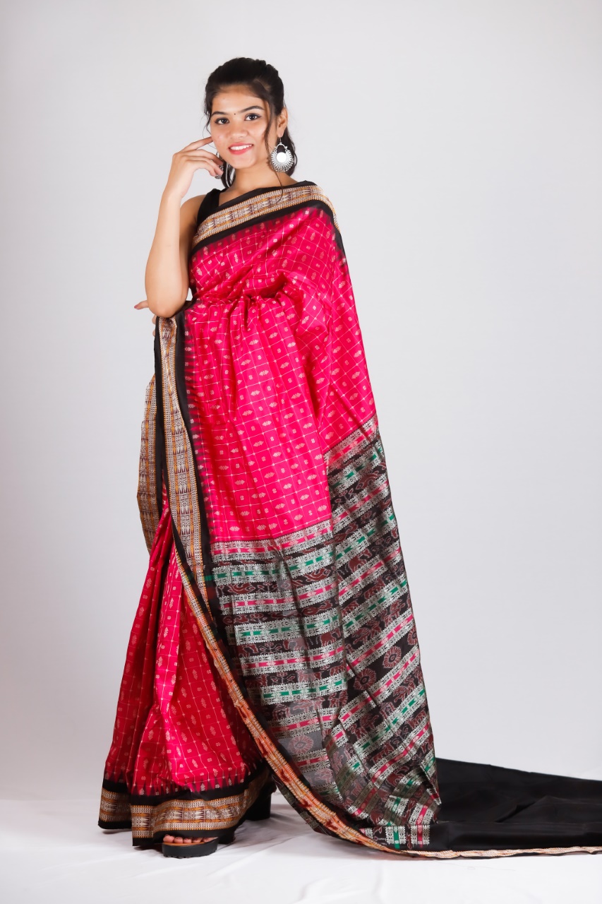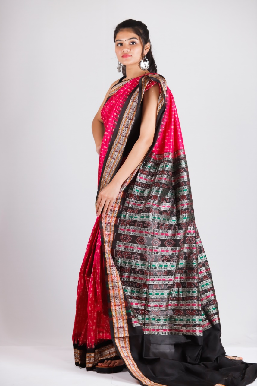 Sambalpuri sarees are known for their incorporation of traditional motifs like shankha (shell), chakra (wheel), phula (flower), all of which have deep symbolism with the native Odia colour red black and white represent true Odia Culture alongwith Lord Kaalia(Jagannatha)’s face colour,