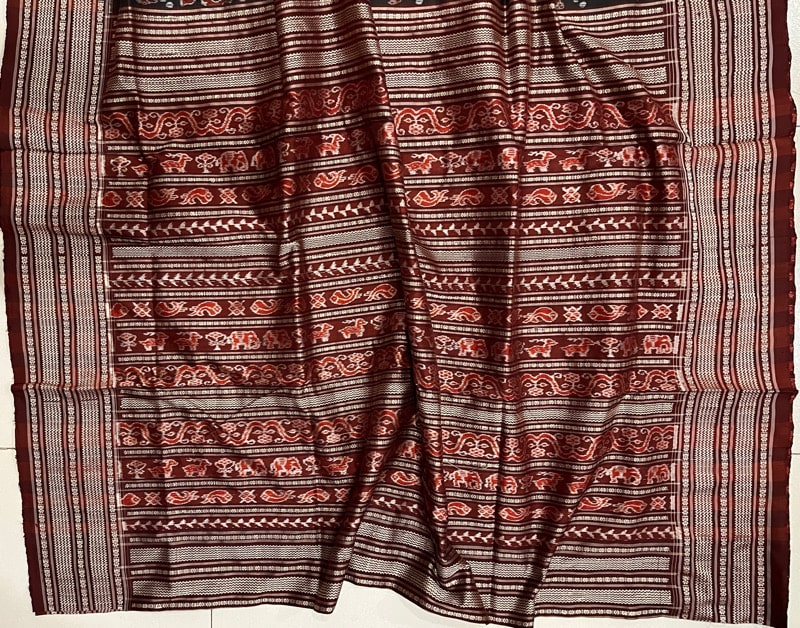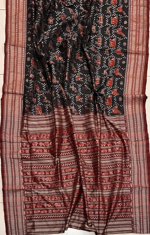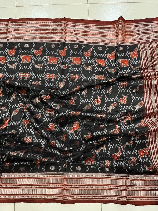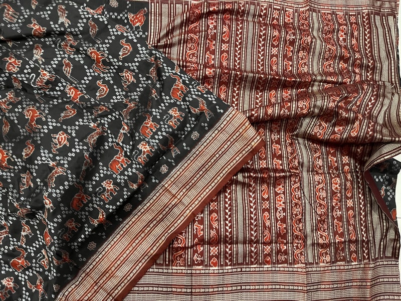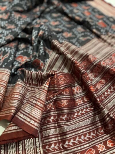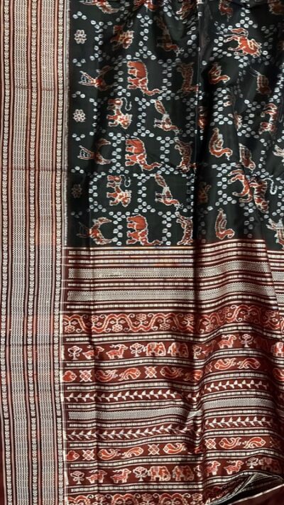 Sambalpuri sarees are known for their incorporation of traditional motifs like shankha (shell), chakra (wheel), phula (flower), all of which have deep symbolism with the native Odia colour red black and white represent true Odia Culture alongwith Lord Kaalia(Jagannatha)’s face colour,
