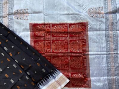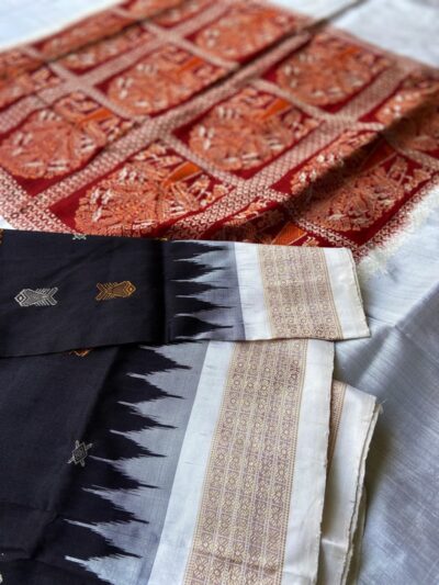 Bomkai – Modern in Design with Traditional Tinge, Bomkai cotton sarees are mostly accepted for habitual wear and the silk sari is put on ceremonies and sacred occasions. Most of the stylish saree are embodied with captivating color to give the gracious look to the woman wearing the saree. The ancient belief is depicted in its border Mostly the design of fish is seen in the sari as it is believed to be a sign of success and affluence. The most charming part is its thread work in the designs of the border and the palloo. The appearance of the saree is related to simplicity and has a tribal tinge in it. The sari is normally dyed to attain the red, black and white background colours. However, today you will find the sari in several designs and multiple colours while retaining their originality. The warps are suitably woven to produce multicoloured end piece.
