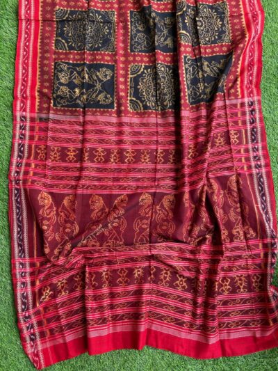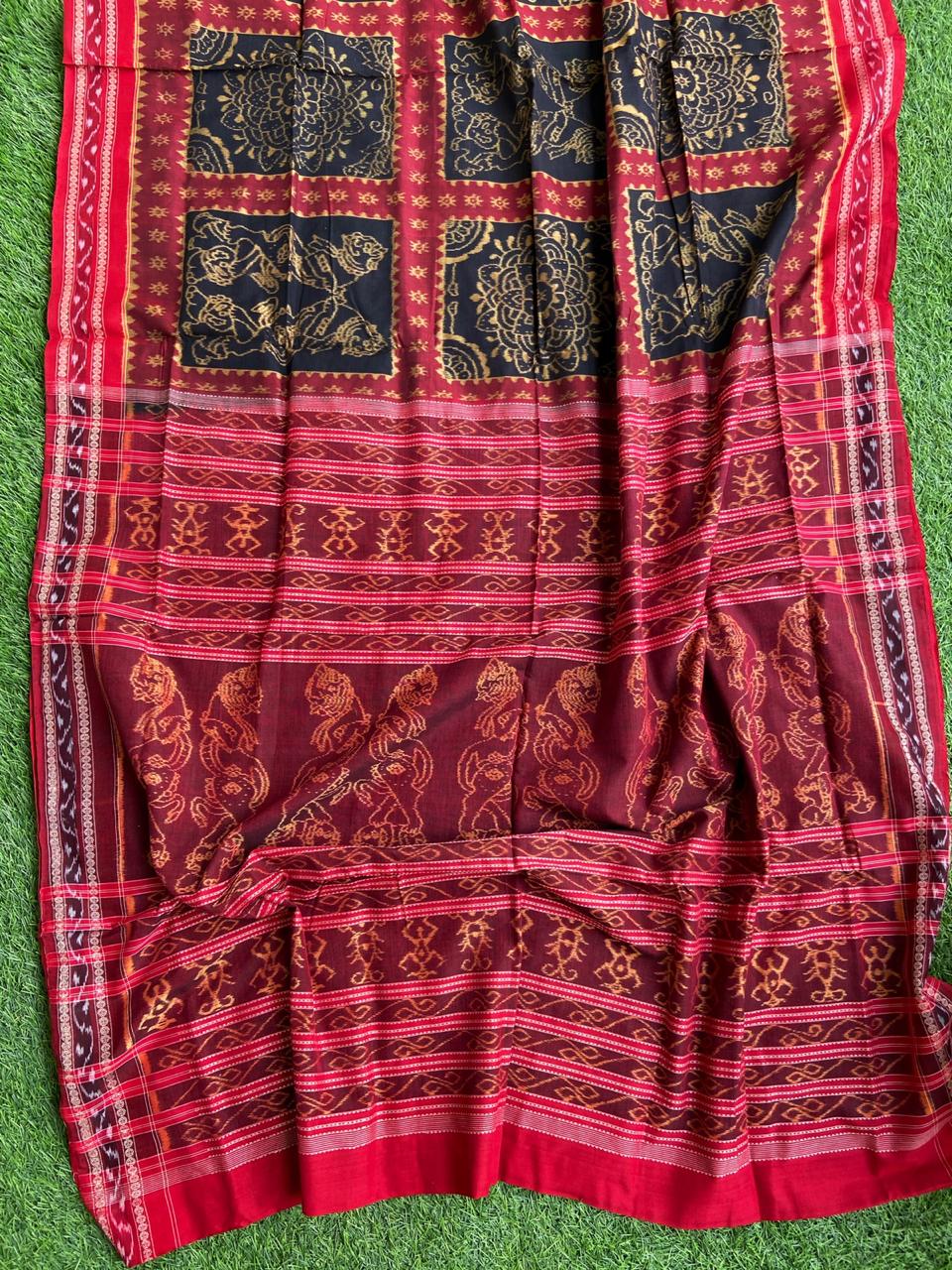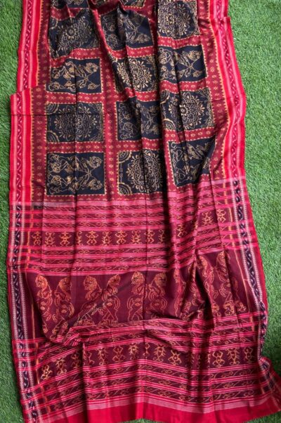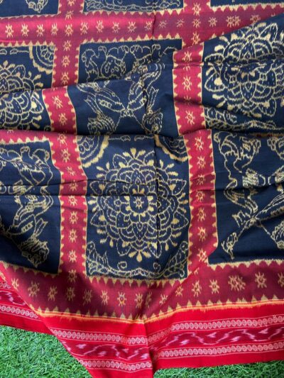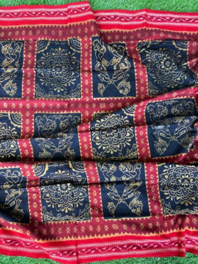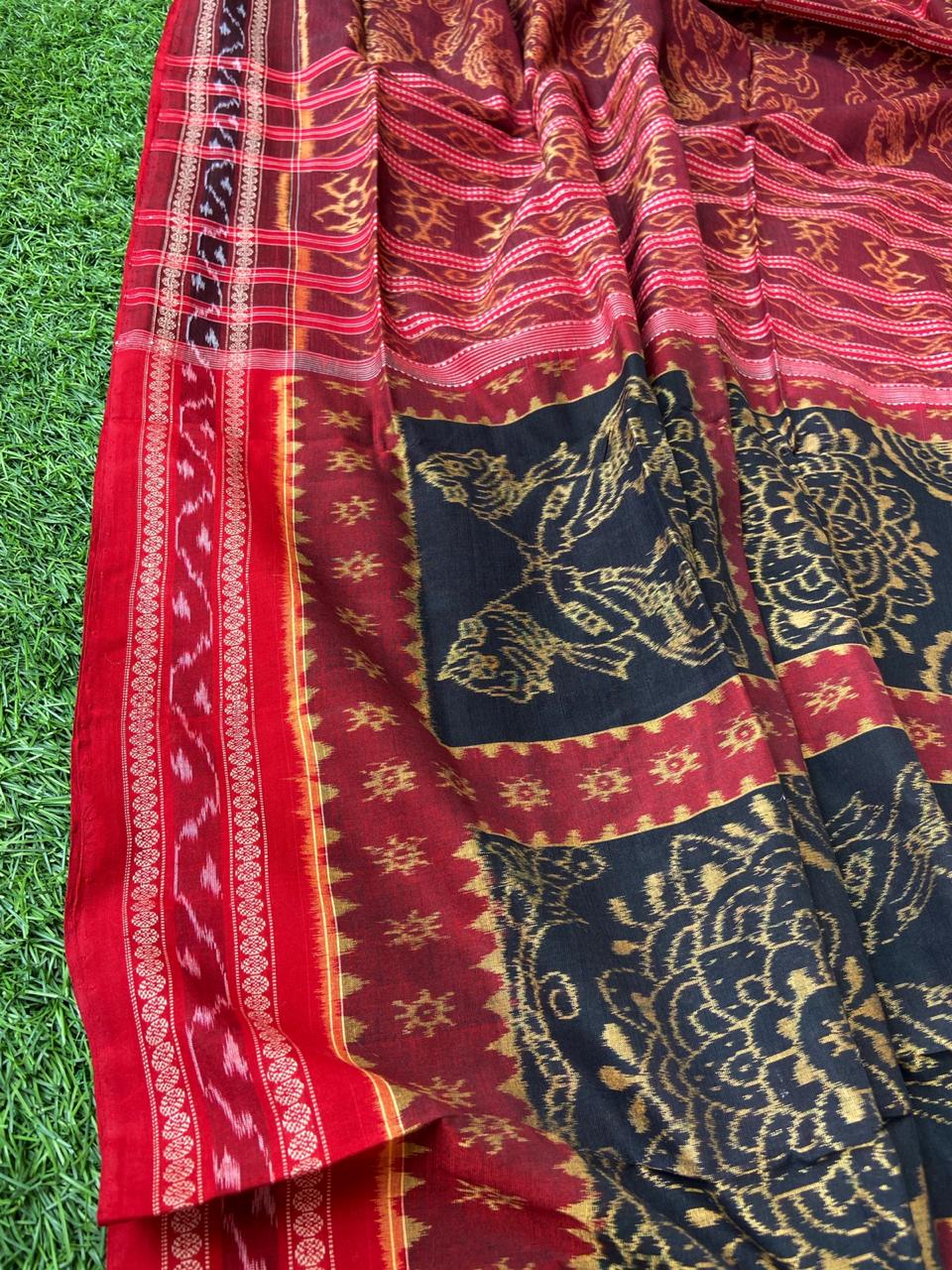 Sambalpuri sarees are known for their incorporation of traditional motifs like shankha (shell), chakra (wheel), phula (flower), all of which have deep symbolism with the native Odia colour red black and white represent true Odia Culture alongwith Lord Kaalia(Jagannatha)’s face colour,