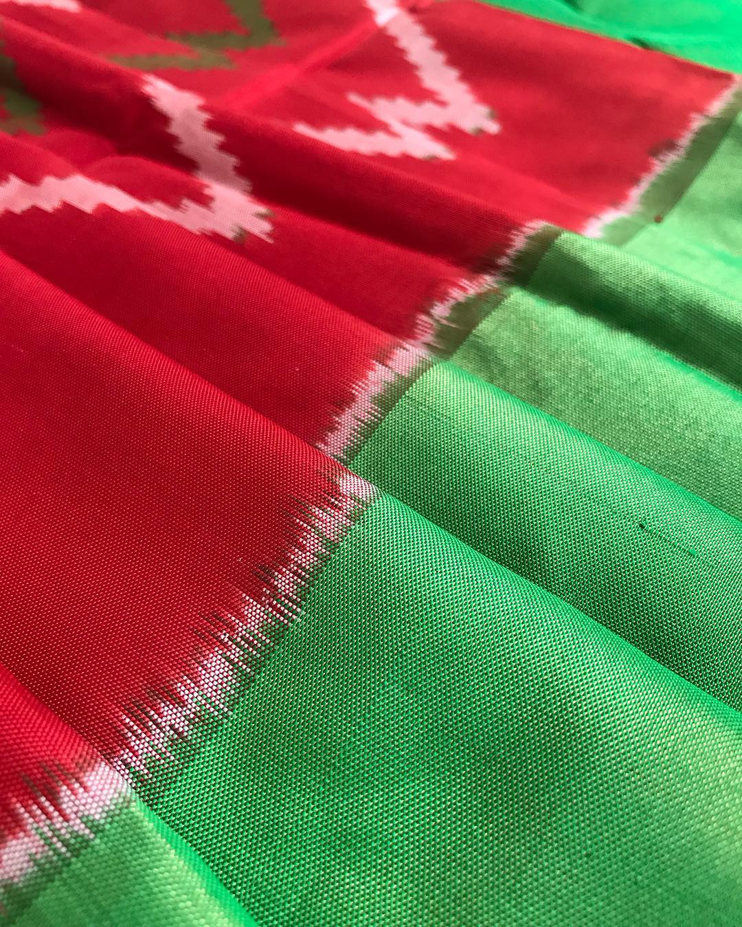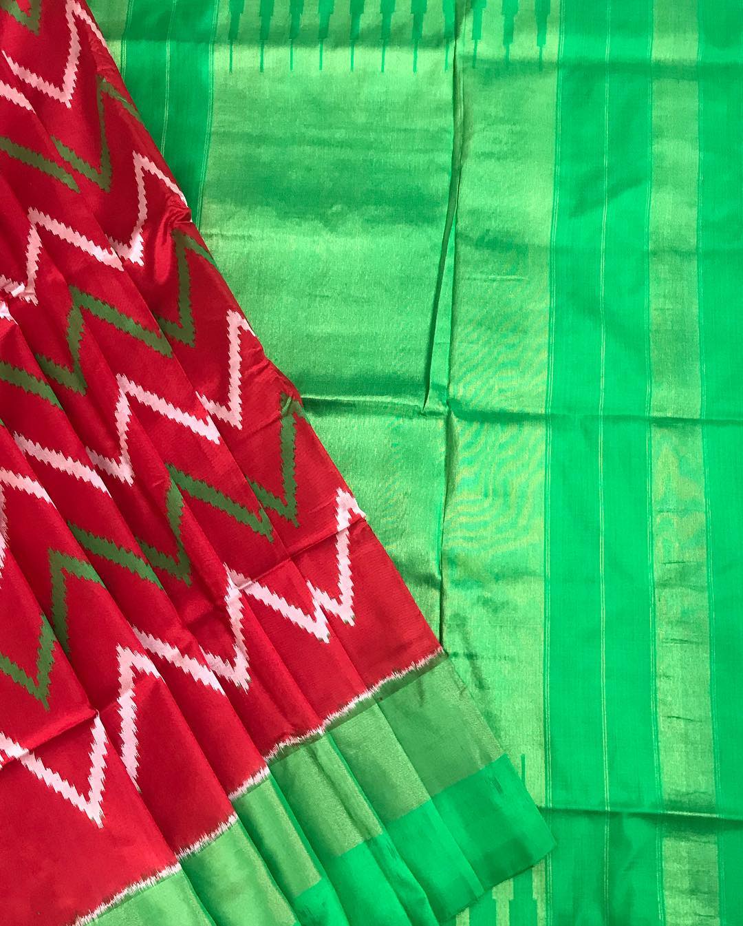 Pochampally Ikat sarees are woven in Bhoodan Pochampally, Telengana.  The intricate geometric design is unique to these weaves and makes them stand apart. It takes a family of four to 10 days to weave one saree .Pochampally Ikat uniqueness lies in the transfer of intricate design and colouring onto warp and weft threads first and then weave them together globally known as double ikat textiles. Pochampally ikats can be differentiated from their cousins in Orissa by their feel. Pochampalli cloth is smoother than the flannelly Orissa cloth and not quite as heavy.