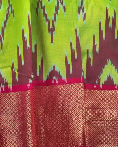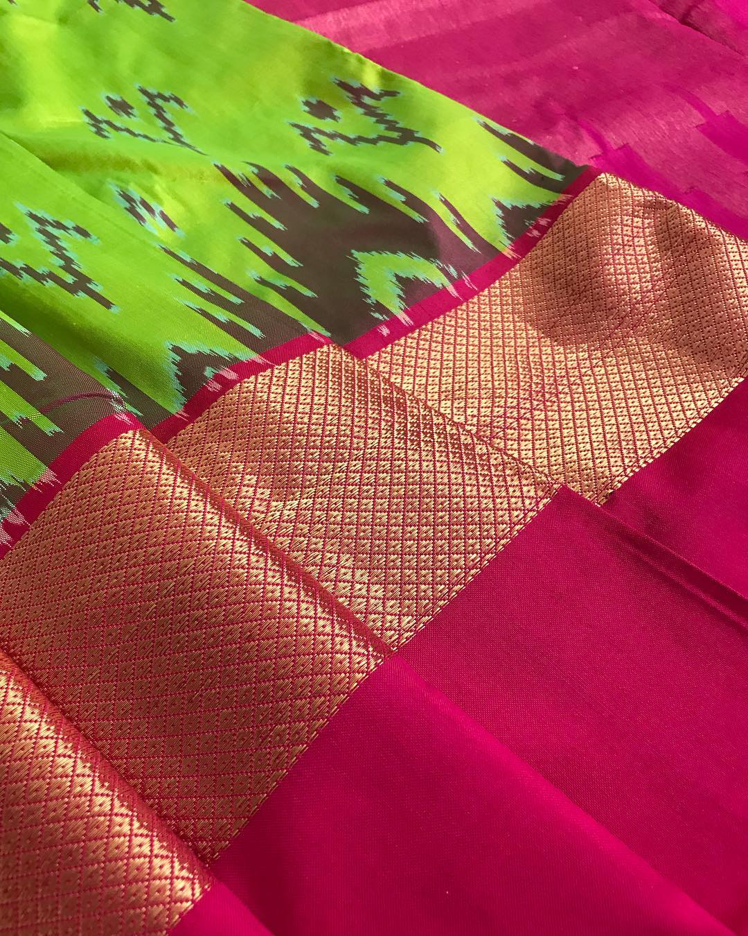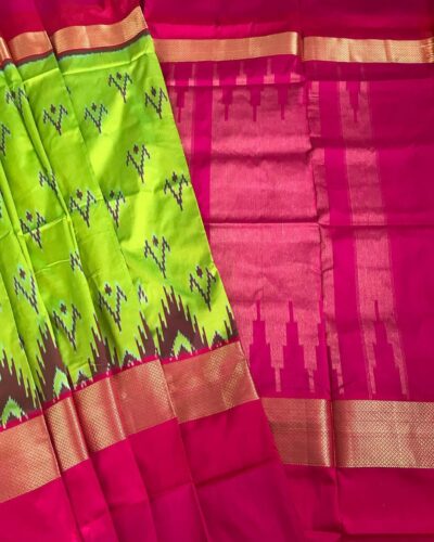 Pochampally Ikat sarees are woven in Bhoodan Pochampally, Telengana. The intricate geometric design is unique to these weaves and makes them stand apart. It takes a family of four to 10 days to weave one saree .Pochampally Ikat uniqueness lies in the transfer of intricate design and colouring onto warp and weft threads first and then weave them together globally known as double ikat textiles. Pochampally ikats can be differentiated from their cousins in Orissa by their feel. Pochampalli cloth is smoother than the flannelly Orissa cloth and not quite as heavy.