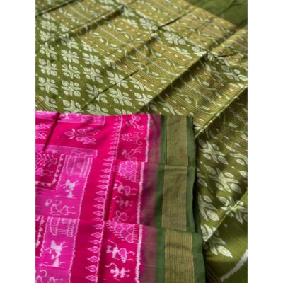 A Sambalpuri saree is a traditional handwoven ikat or sari (locally called sadhi) wherein the warp and the weft are tie-dyed before weaving. It is produced in the Bargarh, Sonepur, Sambalpur, Balangir district, Boudh District of Odisha. The saree is a traditional female garment in the Indian Subcontinent consisting of a strip of unstitched cloth ranging from four to nine metres in length that is draped over the body in various styles.