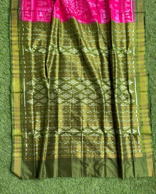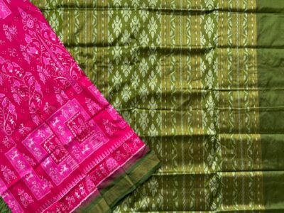 Two versions of Jagannath iconography but the highpoint of these sarees is the traditional craftsmanship of the ‘Bandhakala’, the Tie-dye art reflected in their intricate weaves, also known as Sambalpuri “Ikkat”. In this technique, the threads are first tie-dyed and later woven into a fabric, with the entire process taking many weeks. These sarees first became popular outside the state when the late Prime Minister Indira Gandhi started wearing them. In the 1980s and 1990s they became popular across India. To provide protection to the weavers practicing this art, the handloom silk sarees manufactured in Sambalpur and Berhampur (Berhampur Pattu) in Odisha were included in the Government of India’s Geographical Indications (GI) registry.