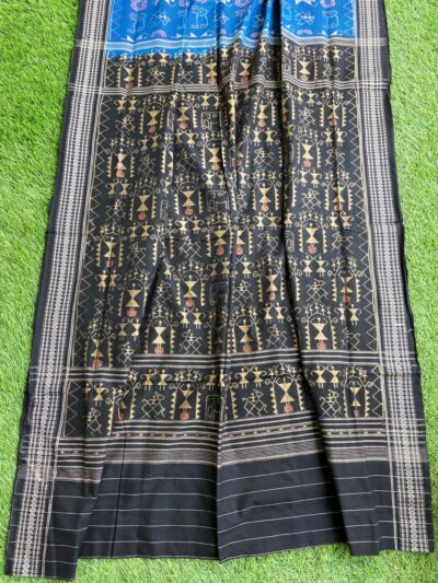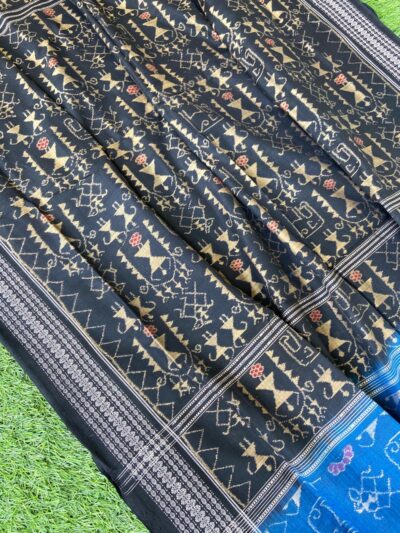 Sambalpuri sarees are known for their incorporation of traditional motifs like shankha (shell), chakra (wheel), phula (flower), all of which have deep symbolism with the native Odia colour red black and white represent true Odia Culture alongwith Lord Kaalia(Jagannatha)’s face colour,